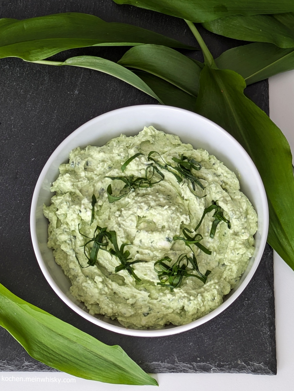 Wer die Bärlauch-Feta-Creme zum Servieren noch nett dekorieren möchte, kann feine Bärlauchstreifen darüber geben.