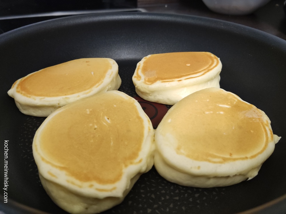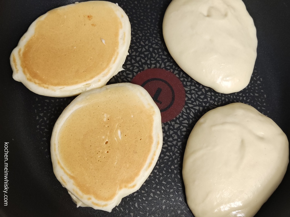 Bei mittlerer Hitze von beiden Seiten jeweils etwa 2 Minuten goldbraun ausbacken. Die Drop Scones gehen dabei deutlich auf. Aus der Pfanne nehmen und warmstellen, bis alle Drop Scones fertig ausgebacken sind.