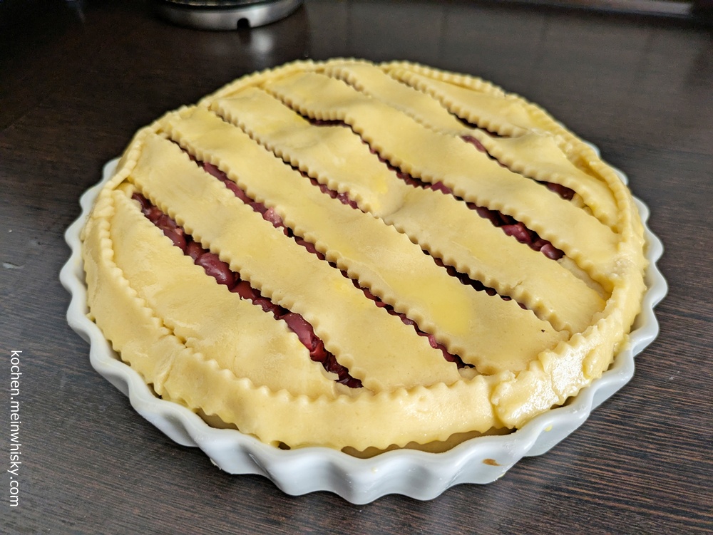 Den restlichen Teig rollt ihr nun ebenfalls auf der bemehlten Fläche aus und schneidet ihn in Streifen. Damit belegt ihr die Pie nach Belieben, entweder nur in Längsrichtung oder auch als Gitter. Ihr könnt auch auf das Streifen-Schneiden verzichten und den Teig als Deckel auflegen. In diesem Fall solltet ihr ein paar Schlitze hineinschneiden.
