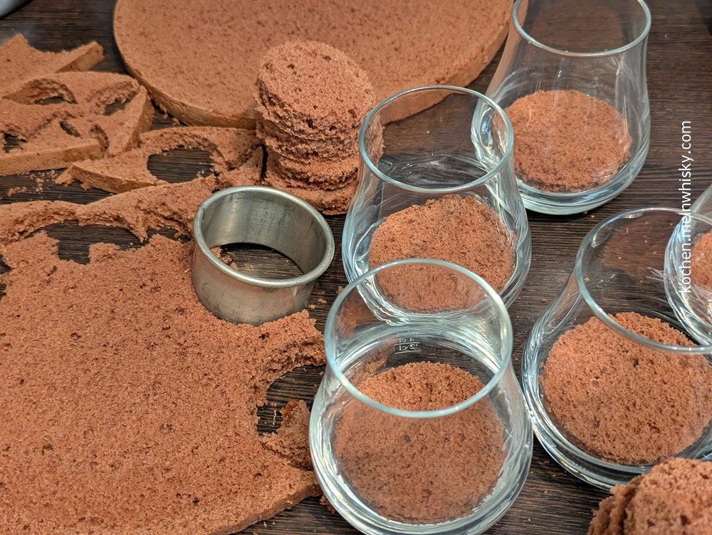 Zum Backen des Biskuitbodens die Eier zusammen mit dem Zucker aufschlagen. Mehl und Kakaopulver sieben und unter die Masse heben. In einer Springform im 180-200°C heißen Backofen bei Ober-/Unterhitze etwa 30 Minuten backen. Abkühlen lassen, aus der Form lösen und waagerecht in etwa 1,5 cm breite Scheiben schneiden. Pro Portionsglas je zwei Biskuitkreise mit passendem Durchmesser ausstechen (Ich habe dabei nur die Hälfte des Biskuits benötigt, der Rest wird wohl zu Rum- oder Whiskykugeln verarbeitet 😊).